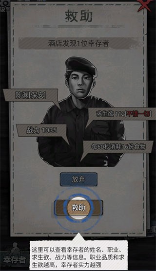 点击“救助”选项,即可查看该幸存者的详细属性与技能信息。