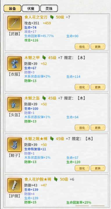 40级装备推荐:狼妖牙(35级)、狐怪耳(35级);50级及55级统一选用木魃牙(45级)、木魃头皮(45级)。