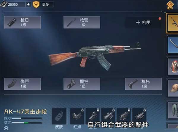 枪械按品级分为白、蓝、紫、橙、金五档,金枪具备最高基础属性与词条强度;评分系统直观呈现综合战力,便于玩家快速筛选;配件系统支持瞄准镜、枪口、弹匣等多维度改装,满配金枪即为毕业配置。