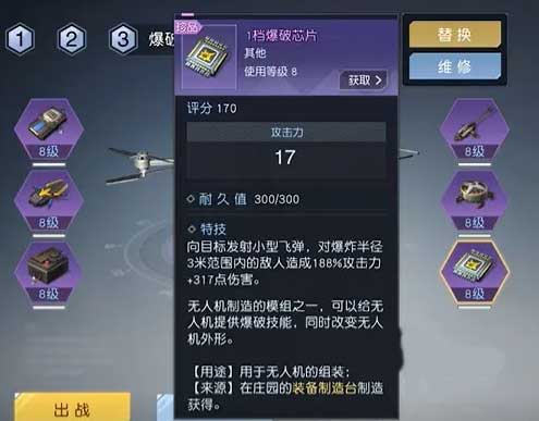 无人机为十级解锁的功能类装备,配备六个可装配模块,分别强化输出、机动性与续航能力;模块含火箭弹、机枪、电磁爆破、友军治疗等特效类型,数值与品质随品级提升。