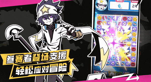 游戏采用欧美漫风融合潮酷审美的视觉设计,金、格瑞、嘉德罗斯、凯莉等动画核心角色悉数登场。三消棋盘嵌入参赛者形象,每局支持4枚角色棋子自由编队;消除动作不仅触发连锁反应,更能激活角色技能,释放元力风暴对敌方造成精准打击。