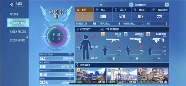 完善的玩家数据统计:从段位等级、MVP次数、信誉分到KDA比值、各地图胜负分布等核心维度,所有战绩数据均可在游戏内实时查阅,助力复盘与成长。