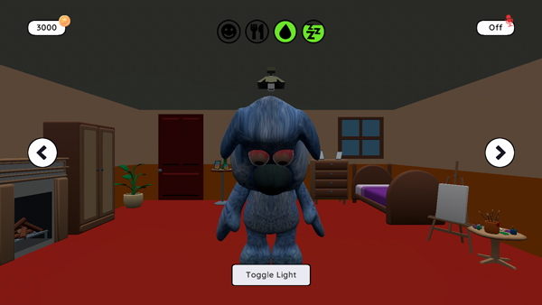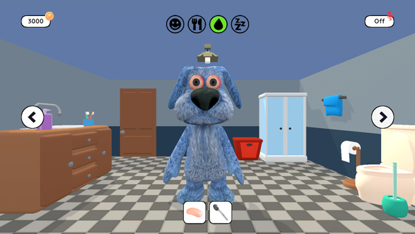 在浴室中使用肥皂为巴勃罗洗澡,清洁行为不仅带来视觉反馈,还会同步提升其卫生数值。