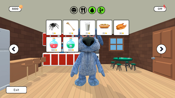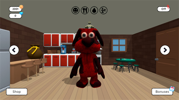 轻触屏幕左右两侧方向键,即可在厨房、浴室、卧室等不同生活场景间自由切换,例如进入厨房为它准备食物。