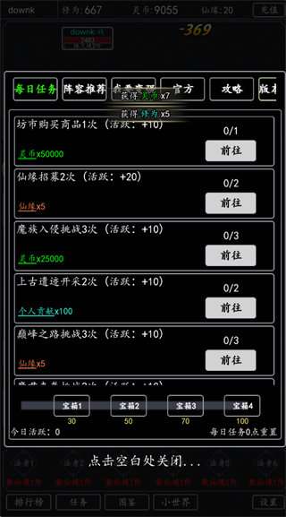 1、每日任务:优先完成活跃度任务,稳定获取灵币(用于角色升级)、仙缘(用于伙伴招募)及个人贡献(兑换稀有道具)。