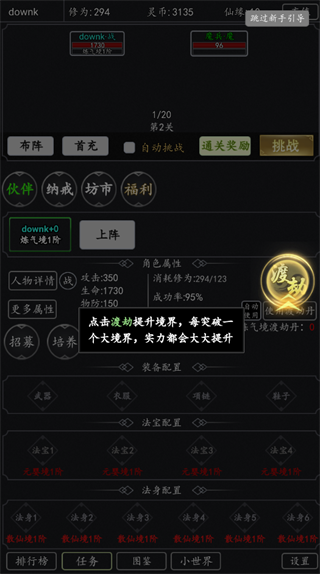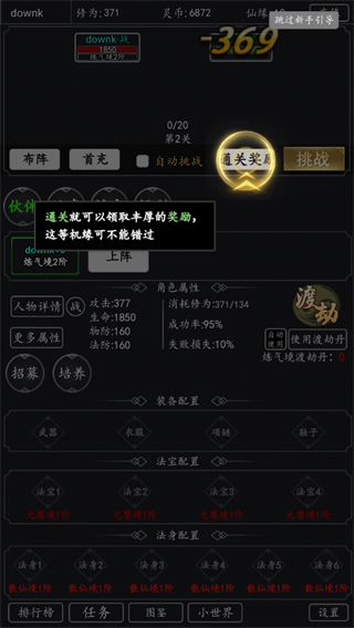 渡劫突破:修为达标后点击“渡劫”即可尝试突破境界。