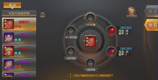 【镶嵌规则】单件装备最多嵌入6颗宝石,同属性宝石不可重复镶嵌;孔位数量取决于装备阶数,高阶替换低阶时,旧装自动返还背包;点击已镶宝石即可卸下或更换。
