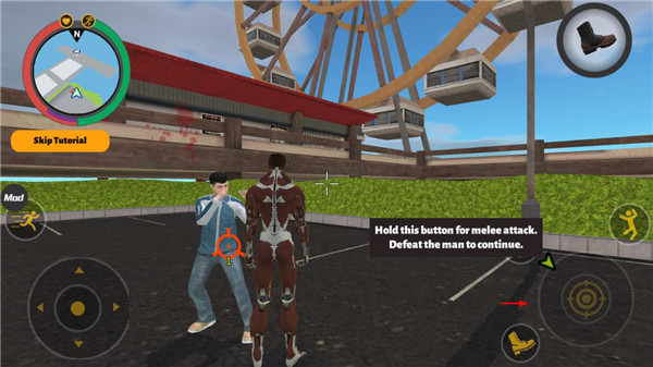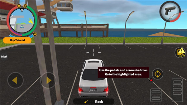 进入游戏后,使用左侧虚拟摇杆控制角色移动,靠近目标区域(如9米外的高亮平台)即可触发互动。近战攻击时,长按右下角按钮可发动强力连击,击败敌人推进剧情。点击右上角武器图标,可随时切换枪械、投掷物等装备。遇到载具时,点击“上车”按钮即可驾驶,通过踏板控制加速,自由前往城市任意角落。