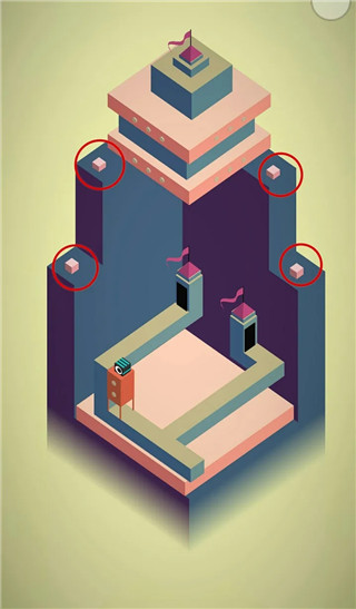 第六关通关技巧: 首先滑动带有白点的橙色小柱子,将小方块移动至第二层平台。随后旋转带白点的四方体,仔细观察四盏小灯的颜色变化。当四盏灯由紫色统一变为黄色时,第二层的门将自动旋转开启,即可进入下一区域。