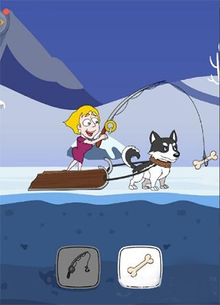 第3场景:乘坐狗拉雪橇却无法前行。选择【鱼竿】,鱼钩上挂着骨头吸引狗狗,雪橇顺利启动。
