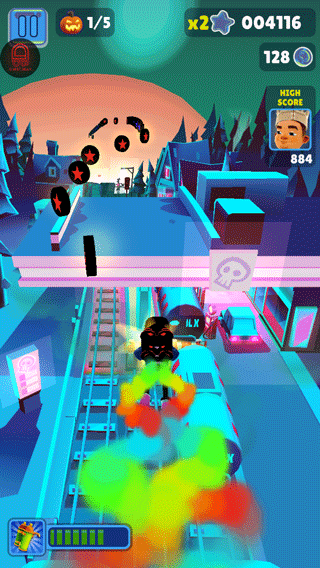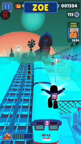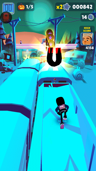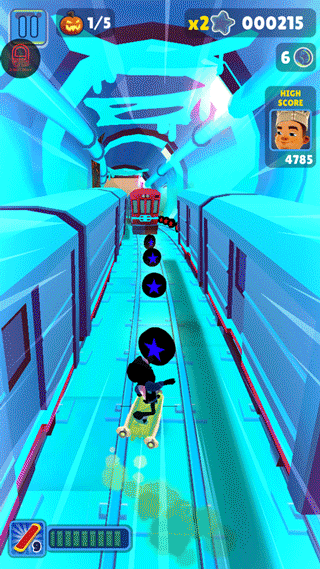 滑板:通过双击屏幕来启动滑板,滑板会持续一段时间。在没有滑板的情况下,角色撞到火车或者障碍等都会被抓住,导致游戏结束。但在有滑板的状态下,角色就有了一道保险,撞到火车等的时候,滑板会消失,游戏可以继续进行。