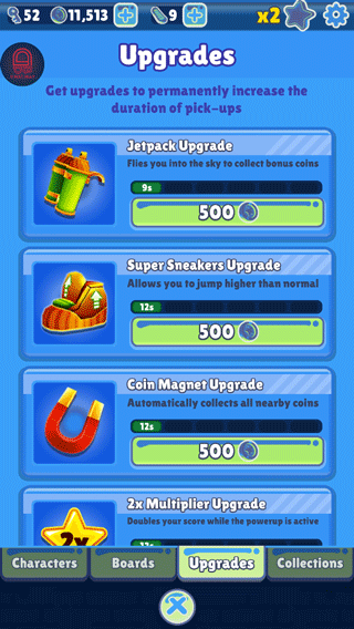 升级:通过金币购买,可以升级道具,使得道具的持续时间更久。升级路线可以按照自己喜好来,不过推荐优先升满喷气背包。
