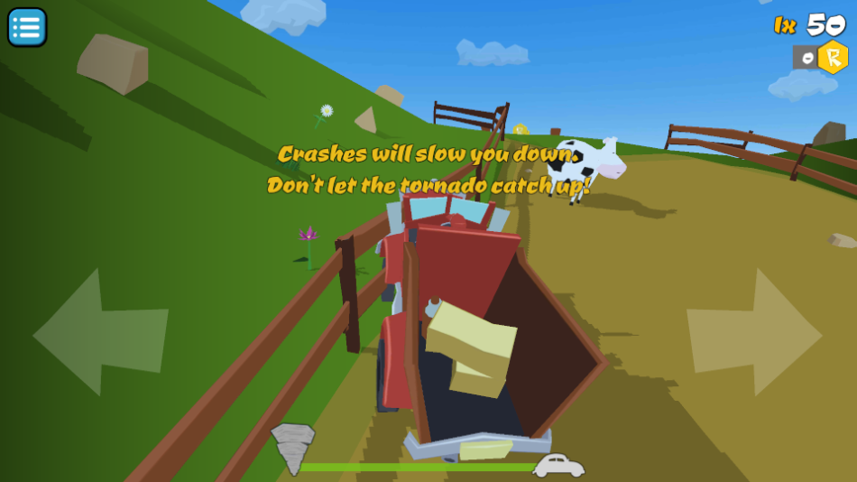 游戏以“逃亡”为核心驱动力,玩家需在无尽奔跑中躲避飞来的杂物与步步紧逼的龙卷风。一边高速前进,一边灵活滑动屏幕控制角色左右移动,精准避开障碍物的同时,尽可能多地拾取散落在道路上的金币。这些金币不仅是高分的关键,更是解锁新载具和角色的重要资源。最终目标是从危机四伏的乡村一路突围,抵达安全区域,完成一场荒诞又刺激的大逃亡。