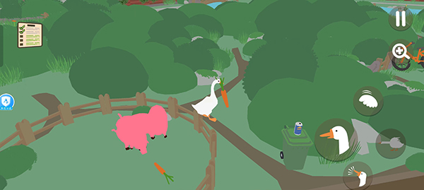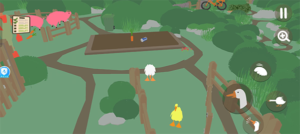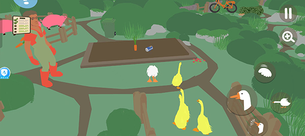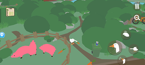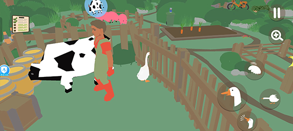 首先将鹅移动至牛棚门口,用嘴推开大门,引出里面的牛。园丁会立即赶来将牛赶回棚内。趁他进入牛棚的瞬间,迅速用嘴叼住门把手将其关闭,即可成功将园丁反锁其中。