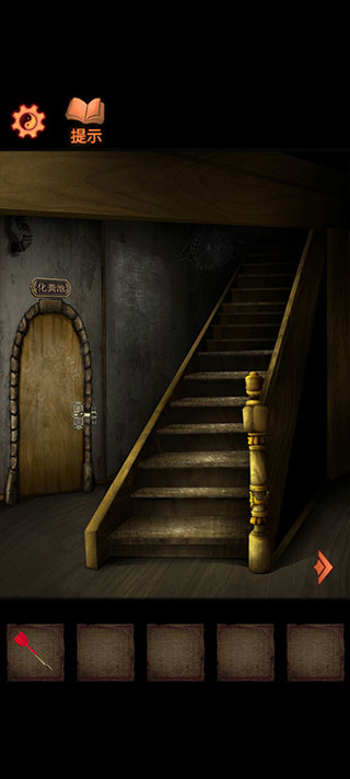 1、过完新手带教后,从电视柜左边取得铁丝,去左视野,点击门右边的木板,用铁丝将木板固定在楼梯缺口处。
