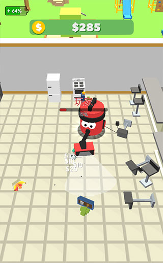 游戏采用立体渲染技术打造清新明亮的3D卡通场景,视觉体验轻松愉悦。玩家通过滑动屏幕控制吸尘器移动方向,自动吸附路径上的物体。每吸入一件物品,吸尘器体积就会增大,同时提升吸力范围与移动速度。但注意——你的对手也在同步成长!只有在电量耗尽前迅速壮大自己,才有机会在多人对战中脱颖而出,成为最终的“清洁霸主”。