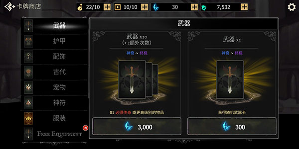 除通关奖励外,高品质武器装备主要通过卡牌商店抽取获得: