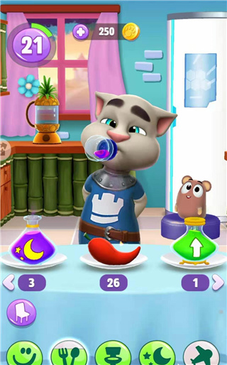 购买成功后,婴儿药水将出现在食物托盘中。点击该药水,汤姆便会一口喝下,随即触发华丽变身特效,仿佛魔法降临一般,瞬间回归圆润可爱的婴儿状态,萌翻全场!