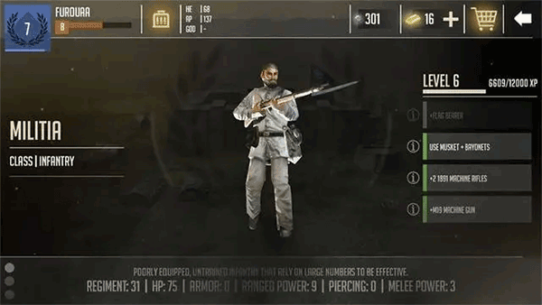 花费20军费可招募一支标准步兵小队。开局赠送一支由三个单位组成的初始部队,可通过“roll”功能随机更换兵种组合(例如三名囚犯不如三名民兵实用)。roll功能位于界面下方。新招募的步兵同理可调整配置。也可选择组建反坦克小组,专门应对敌方碉堡(bunker卡牌,1费+15军费,可部署于补给线路上)。