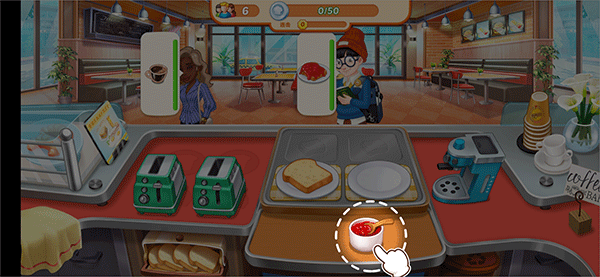 1、进入游戏后,会有客人陆续上门点单,你需要按照提示准备对应食物,比如一位顾客想要一份加番茄酱的面包