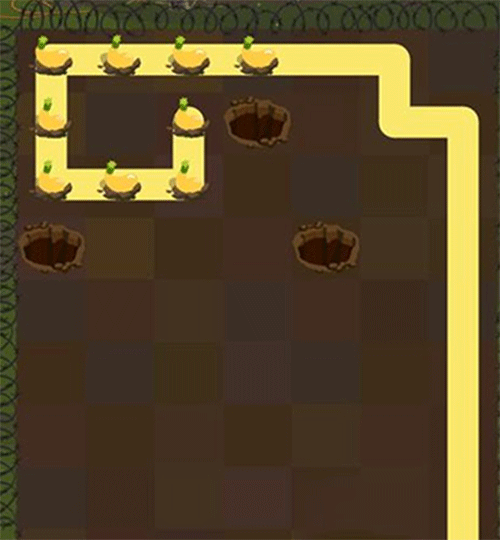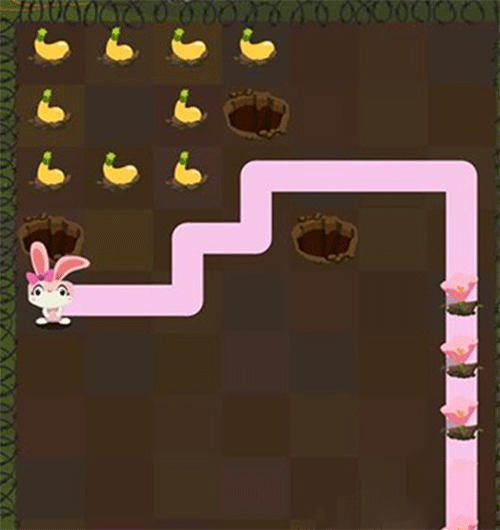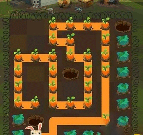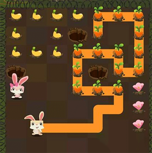 第一步:引导米黄色兔子Calvin沿路径吃掉萝卜,顺利进入土洞。