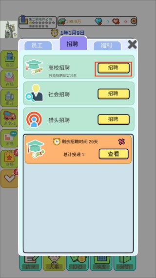 2、快速组建核心团队——点击【招聘】,为土地开发匹配专业员工;