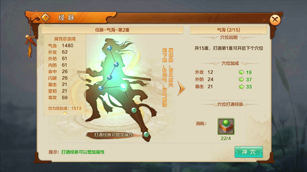 每脉共15重,须逐重打通方可激活下一穴位;每重含7个节点,节点消耗随重数递增——例如任脉第0重仅需3逍遥丹,第1重则升至4颗,以此类推。但请注意:低重节点的单次属性提升有限,远低于高阶经脉同等级增幅。
