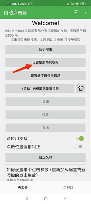 1、安装后首次启动,点击首页【设置辅助功能权限】按钮进入系统设置;