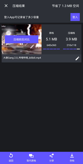 5、压缩完成即时预览,满意后点击底部「保存到相册」或「分享」按钮快速导出。