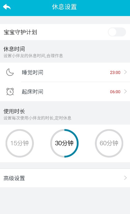 第二步:灵活管理使用时间 进入【父母中心】→ 找到【宝宝守护计划】→ 可自由开关“定时休息”与“夜间休息”功能,并设定具体时段与时长。小伴龙将以孩子最爱的方式温柔提醒,告别强行中断的亲子冲突。