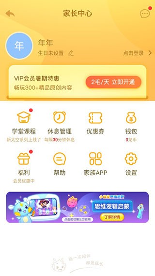 第一步:个性化设置宝宝档案 打开APP → 点击右上角手掌印图标 → 进入【父母中心】→ 点击头像 → 在【我的宝宝】页填写小名、性别、生日并选择头像。从此,小伴龙将用专属称呼开启每一次互动。