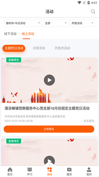 活动页集中展示线上线下党建服务项目,支持按时间轴浏览或按主题关键词精准检索。