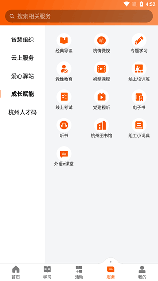 服务页整合智慧组织管理、云上业务办理、爱心驿站对接、成长赋能工具及杭州人才码申领等一站式服务入口。