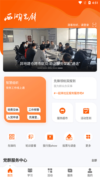首页集成每日重点资讯推荐、党费缴纳、入党申请提交、工作预警提醒、活动扫码签到、服务超市入口等高频功能,操作直观高效。