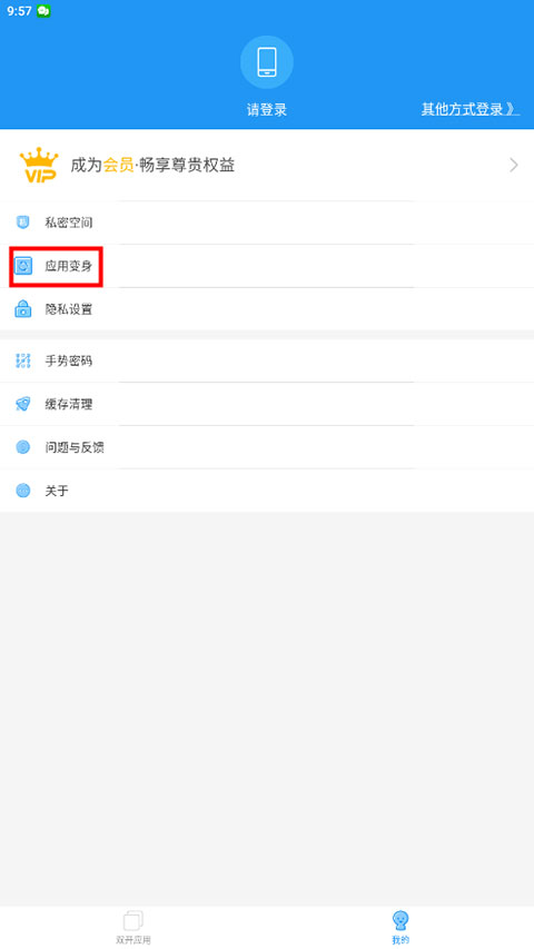 担心分身图标暴露隐私?「应用变身」功能让你轻松伪装:在「我的」页面开启该选项,可将微分身双开主图标一键变更为计算器、备忘录、天气等常用工具图标,彻底隐藏真实用途,兼顾实用与私密。