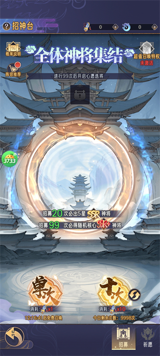 核心抽卡系统支持心愿选将机制,每累计20次必出SSR,99次内 guaranteed 获得SSR+神将双保底。