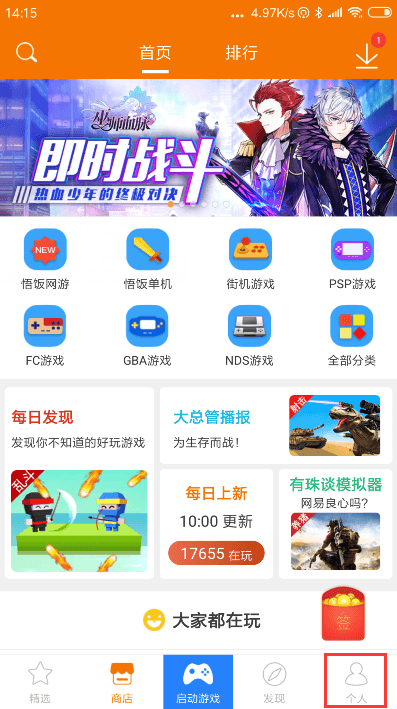 2. 启动悟饭游戏厅,点击首页右下角「个人」入口