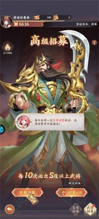 每日登录必领免费招募次数,每满10次必定获得S级或更高品质武将;前期建议优先囤积招募令,待限时活动开启时集中十连,大幅提升高星名将获取效率。