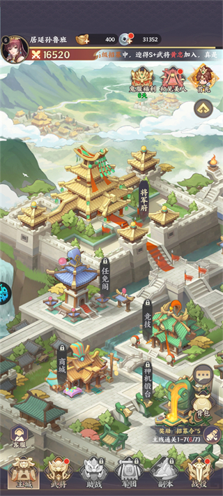 主城作为战略中枢,随进度逐步开放将军府、任免阁等功能建筑,承载武将任免、技能升级、跨服竞技等核心养成与对抗模块,全面提升主公综合实力。