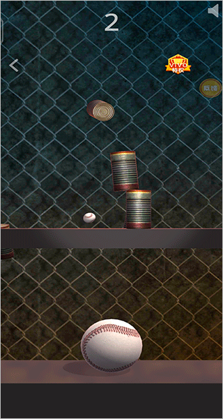 进入“抛球击罐”,滑动瞄准发射棒球,精准击倒全部罐体;