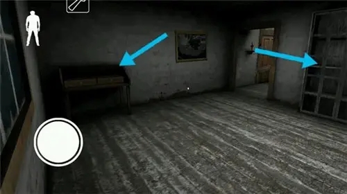 下楼后左侧地板延伸出一条黑色电线,踩踏会触发铃铛报警,需格外小心。楼梯旁的柜子可供躲藏,对面有一扇门可能刷新物品。旁边另有一扇通往地下室的入口(光线昏暗易忽略),而老奶奶的初始出生点即位于地下室,新手切勿贸然深入。提醒:此后不再重复提示此类细节。所有墙面悬挂物(画作、相框等)均可被打落,建议行进时远离墙壁。