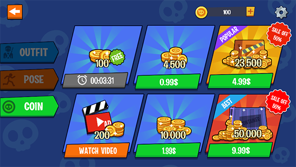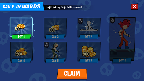 游戏开局即送福利:首先进入商店领取新手奖励,新玩家可多次领取基础装备;每日登录必得「每日奖励」,持续积累资源;接着进入「运动模式」自定义火柴人行为逻辑(静止/行走/跳跃/闪避);点击「运行」按钮正式开战;通过左下角方向键控制角色移动与跳跃,精准操控击杀节奏;完成击杀后火柴人倒地瞬间自动结算奖励,立即开启下一轮挑战。