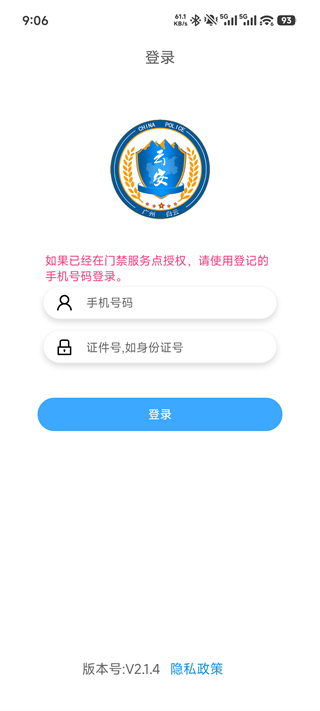 启动App后,使用注册时登记的手机号码与有效证件号码完成身份验证并登录。