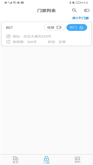 点击底部【门禁】标签,进入已绑定门禁设备列表页,可查阅各门禁的编号、安装地址、授权有效期及当前启用状态,并支持调取实时视频与执行一键开门指令。