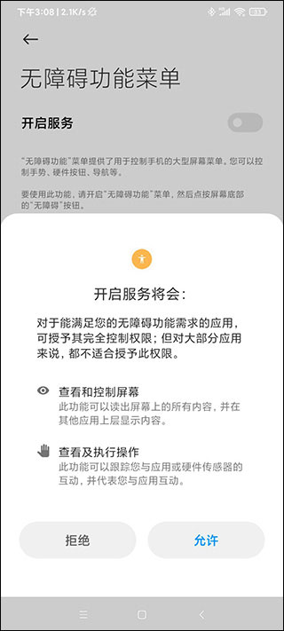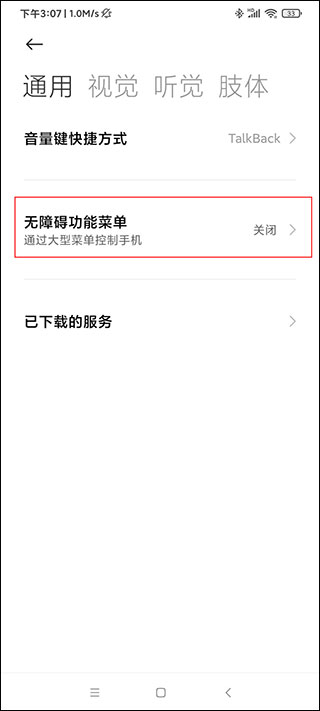 2、点击进入“辅助功能权限”,找到系统中的“无障碍功能菜单”,默认处于关闭状态,需手动开启。